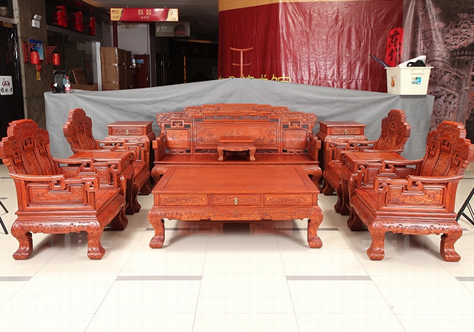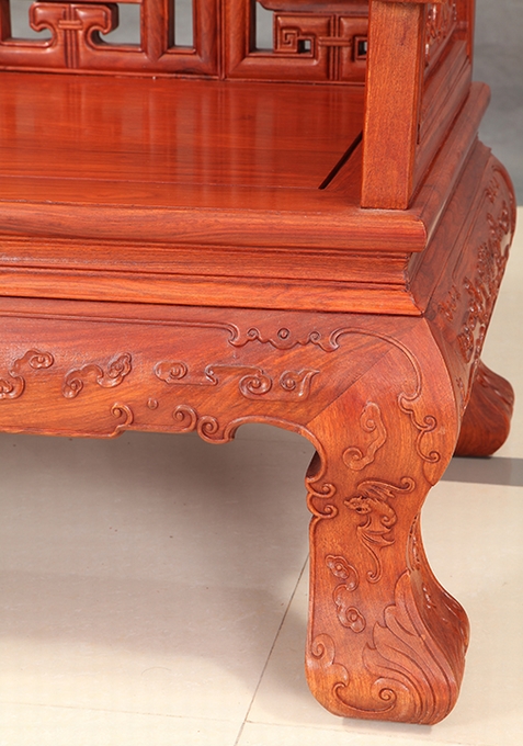 而今天,我們福林堂紅木要為大家介紹的這一款沙發——祥云寶座沙發,即是這樣一款以之祥云為主要裝飾圖案,附之以蝙蝠、銅錢、磬(Qing)、八寶、行龍紋、魚紋、如意等多種象征寓意紋飾組合而成,另外沙發整體之外觀仿照古代帝王之寶座外觀設計,顯得十分地氣派張揚與尊貴,十分適合給那些身份及地位都十分顯赫、重要的人物使用,是一座尊貴的席位,在家中擺放之就好比如置入一座寶座一番,給人以一種沉穩、大氣、威嚴之感受,而這一類風格之家居也正是當下仿古式紅木家具中應用十分廣泛的一類,只不過它現在已經不再顯得那么高高在上的了,而是可以配之以高幾、角幾與大平幾一起使用,感受上更覺舒適平和自然,成為一處可以與普通老百姓一起相陪作伴的普通家居陳設用品。