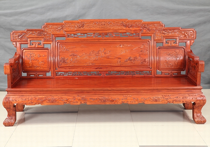 其他幾處紋飾圖案,還包括:在其沙發背靠板處之左右兩側,意帶有“福祿雙至”之意的面朝下飛舞的蝙蝠銜掛著的那四枚銅錢紋飾組合圖案:以及在其背板正中位置處,幅畫有的那一戶小小人家,在一株茂盛的松樹之下,大人與小孩一起快樂生活時的溫馨畫面場景,充滿著濃濃的生活氣息,十分甜蜜;而相對的,在其該處靠背板的背面,則是同樣雕繪有的三處相同之紋飾圖案,其部分是由其寄寓有祥瑞之意的“如意”紋組合而成,總體象征有“吉祥如意”的祝福寓意。